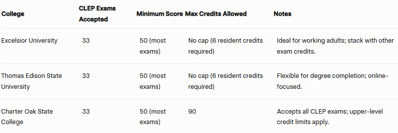 💡 Tip: Online colleges often allow you to stack CLEP with other exams (e.g., DSST) for even more credits.